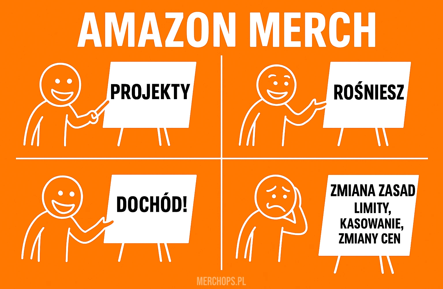 tantiemy Amazon, limity slotów Merch, degradacja konta print on demand, regulamin Merch by Amazon 2025